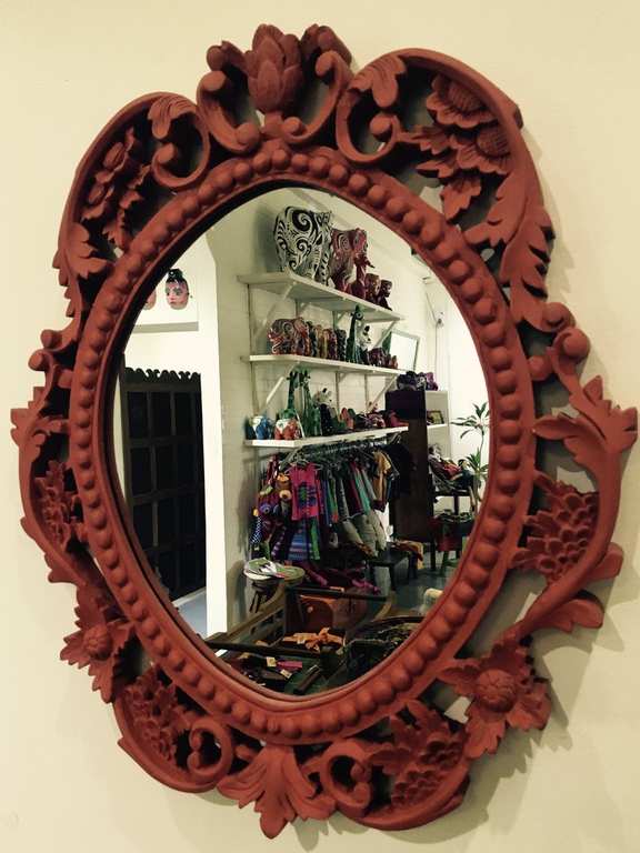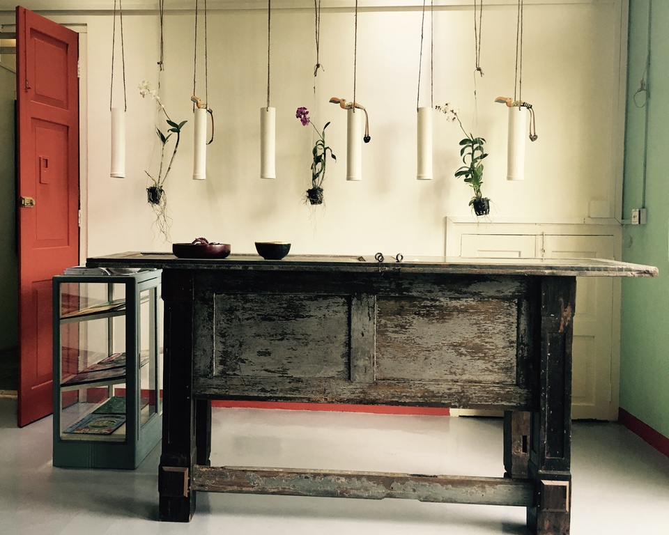 We recycled and reinvented. The counter is made with an handrail of an atique teak wood house that has now been demolished to make space for new high raise buildings. The glass jewelery display
