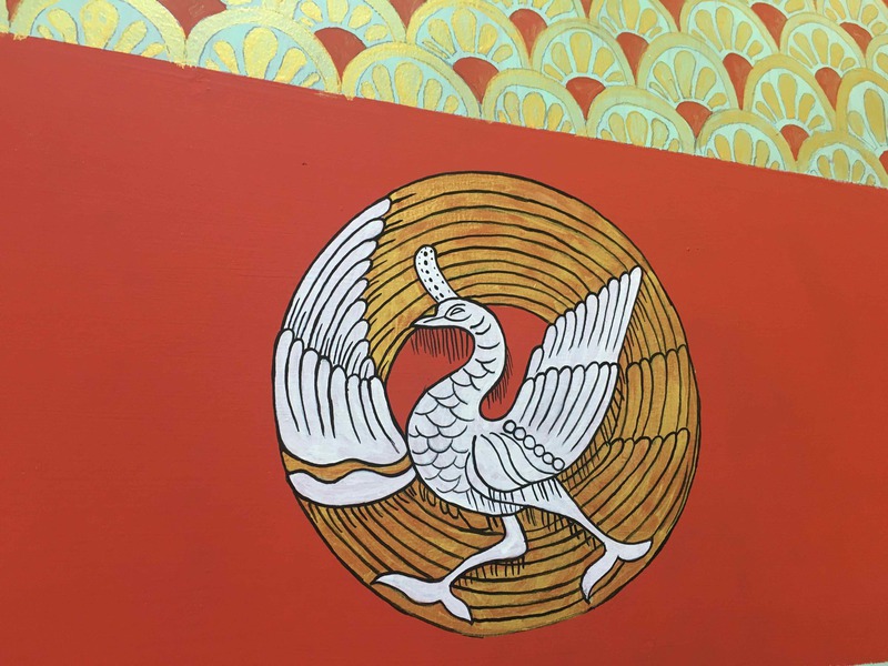 The graphic decor of the walls brings into the store the fantasy and the richness of Myanmar culture. There is the peacock, the symbol of the Country and its Burmese Kings, and its wheel that
